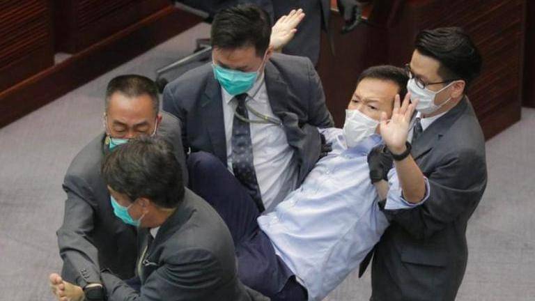The guards carried out several pro-democracy lawmakers, including Eddie Chu and Ray Chan, after they had been ordered to leave for disorderly conduct. Both stepped down on Sept. 30. Chan said on Twitter that he was arrested at 7 a.m. Sunday, and Hong Kong media said that the Chu had also been arrested. The Democratic Party said on its Facebook page that three of its legislative members had been arrested, including party chairman Wu Chi-wai. The May 8 incident was the first in a series of scuffles over a bill approved in June that made it illegal to insult the Chinese national anthem.