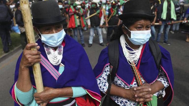 The group of about 5,000 protesters has travelled across the country in rural buses and pickup trucks in a procession known as the minga — an Indigenous term for joint community work or action.