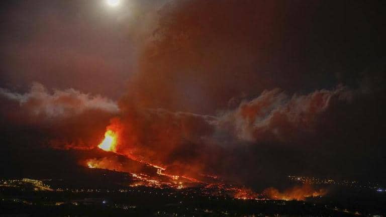 La Palma volcano erupting through night