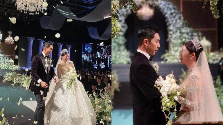 The newly wed pair also cut an extravagant 4-tier cake post their nuptials. Lee Seung-gi changed into a white tuxedo for the event. Lee Da-in also switched it up in a dreamy layered tulle gown, letting her hair down in soft curls. Lee Seung-gi reportedly sang for his newly wed bride as Lee Da-in was seen blushing.