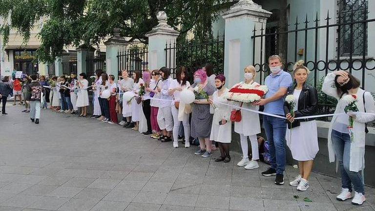 They held a long white ribbon that they called a "chain of solidarity," mirroring an earlier protest held by women in the Belarusan capital Minsk.