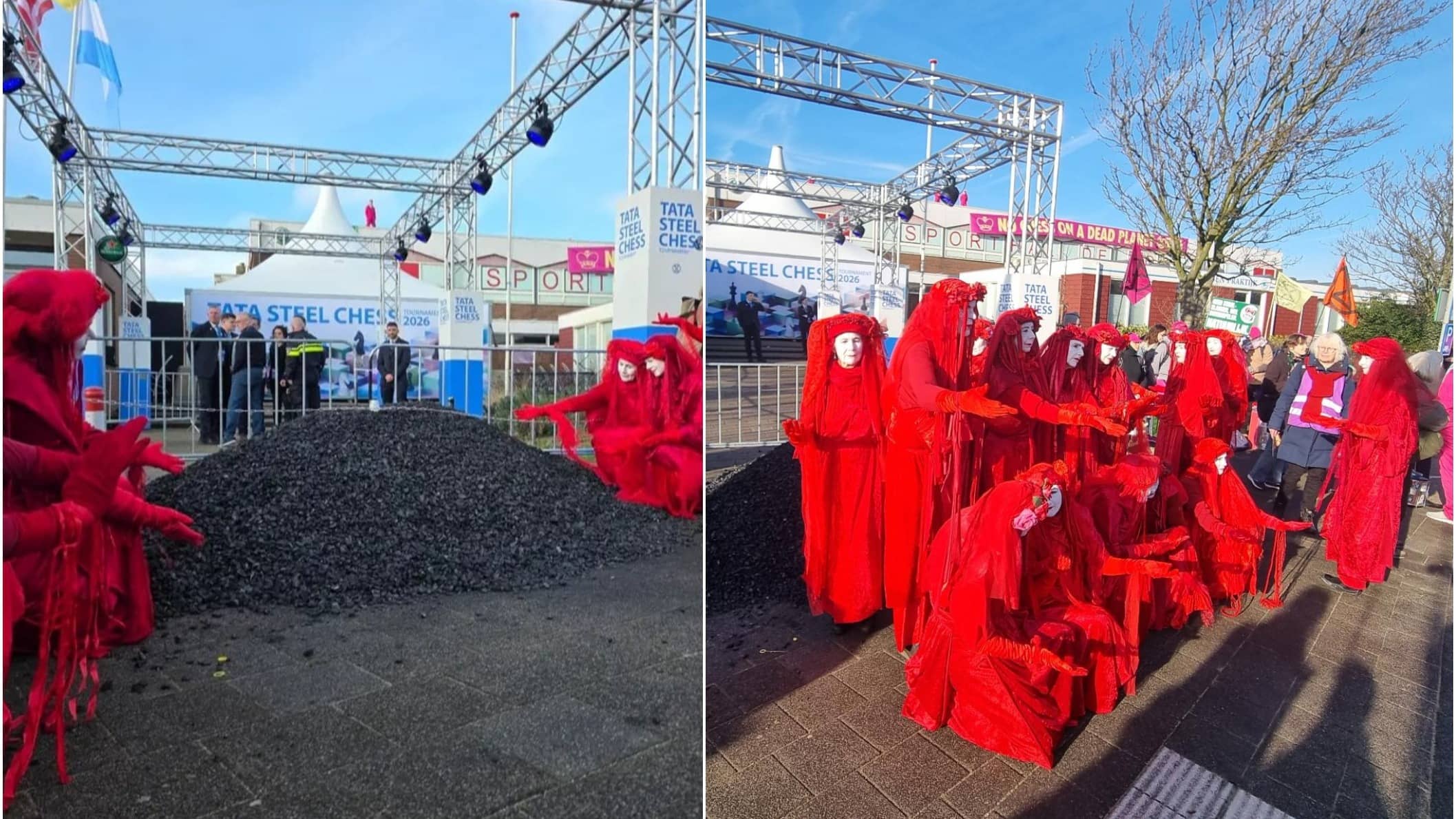 In a series of posts on X (formerly Twitter), Extinction Rebellion Nederland wrote, "Today we are blocking the entrance of the Tata Steel Chess Tournament in Wijk aan Zee. Rebels are dumping 2,025 kilograms of coal, using lock-ons, and hanging a banner reading: 'No Chess on a Dead Planet.' 2025 is the year by which Tata Steel was supposed to become climate neutral. Tata Steel welcomes chess grandmasters while causing brain damage in children. The company is the largest lead emitter in the Netherlands. Children in Wijk aan Zee are growing up under toxic fumes. Lead is always harmful. Tata Steel emits 11.3 megatonnes of COâ‚‚ every year, accounting for 8 percent of the Netherlands' total emissions. The real emissions are higher than what the company reports. The societal damage amounts to more than one billion euros per year. Life expectancy in Wijk aan Zee is 2.5 months shorter. The tournament is sportswashing."