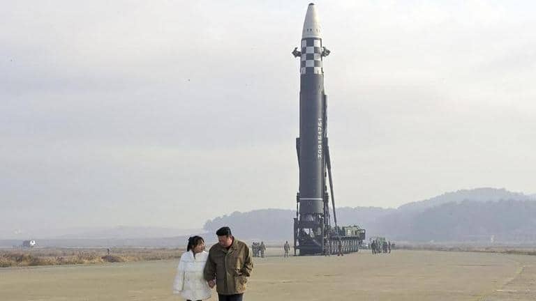 The main Rodong Sinmun newspaper also released a slew of photos of Kim watching a soaring missile from a distance with his daughter. Other photos showed her with her hair pulled back, wearing a white jacket and a pair of red shoes as she walked in hand-in-hand with her father by a huge missile atop a launch truck.
