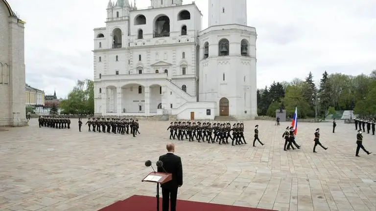 Putin reviewed the Presidential Regiment after he laid flowers at the Tomb of the Unknown Soldier just outside the Kremlin walls, and gave a short address promising further development of Russia's armed forces.
