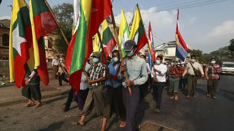 About a thousand protesters marched from various locations in Yangon, Myanmar's largest city, and converged near the famous Shwedagon pagoda.