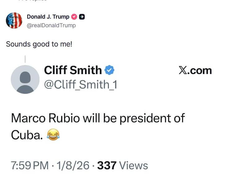 A social media user named Cliff Smit wrote on X, “Marco Rubio will be president of Cuba,” accompanied by a laughing emoji. Trump took a screenshot of the post, shared it on his Truth Social account and responded with the words “Sounds good to me!” The brief reply quickly drew massive attention, prompting speculation and criticism amidst Trump's threat to Cuba to strike a deal with USA before it is "too late".