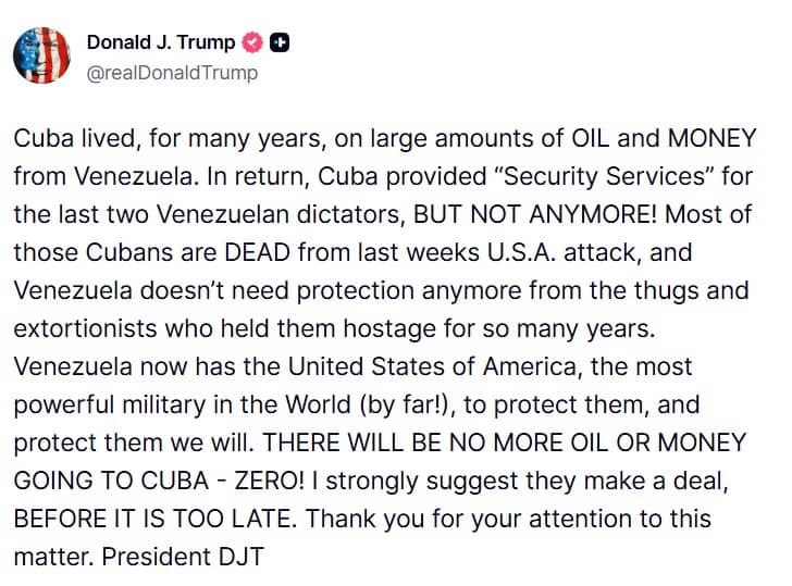 In another post on Truth Social, which was also shared by the White House, Trump said, "Cuba lived, for many years, on large amounts of OIL and MONEY from Venezuela. In return, Cuba provided "Security Services" for the last two Venezuelan dictators, BUT NOT ANYMORE!" He added, "Most of those Cubans are DEAD from last week's U.S.A. attack, and Venezuela doesn't need protection anymore from the thugs and extortionists who held them hostage for so many years. Venezuela now has the United States of America, the most powerful military in the World (by far!), to protect them, and protect them we will. THERE WILL BE NO MORE OIL OR MONEY GOING TO CUBA - ZERO! I strongly suggest they make a deal, BEFORE IT IS TOO LATE."