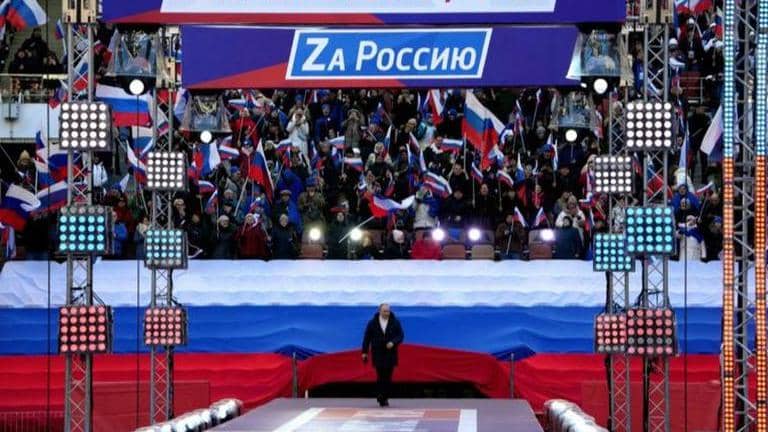 The crowd at the Stadium was heard chanting “Russia! Russia! Russia!” during the address. Banners on stage and in the crowds were seen displaying the letter "Z", which has become a symbol of support for Russia’s invasion of Ukraine, often spotted atop several of its military tanks.