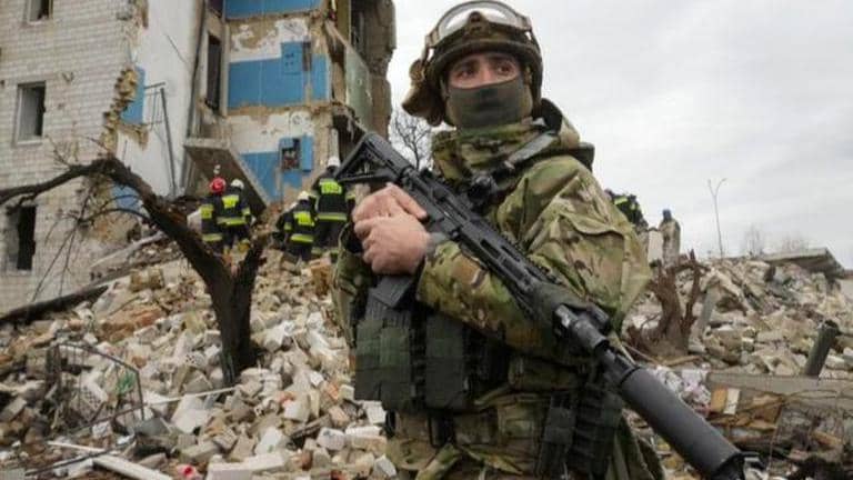 Ukrainian soldiers walk next to heavily damaged residential buildings in Irpin. Credit: AP