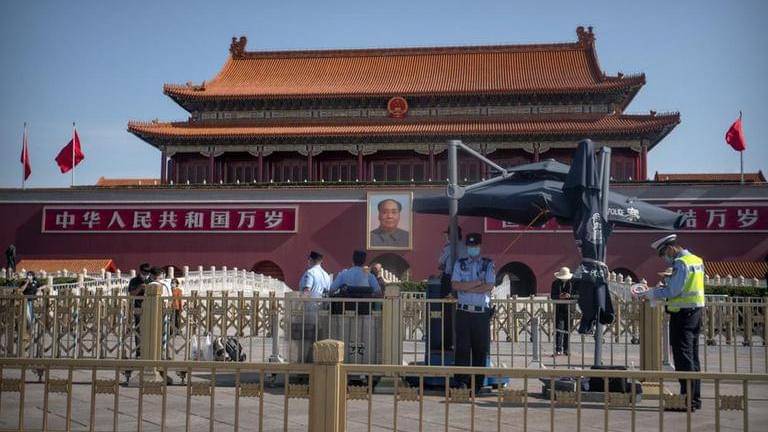 Tiananmen Square was quiet and largely empty on the 31st anniversary of China's bloody crackdown on pro-democracy protests in Beijing. Police and armored vehicles parked around the square. Few pedestrians lined up at security checkpoints waiting to enter.