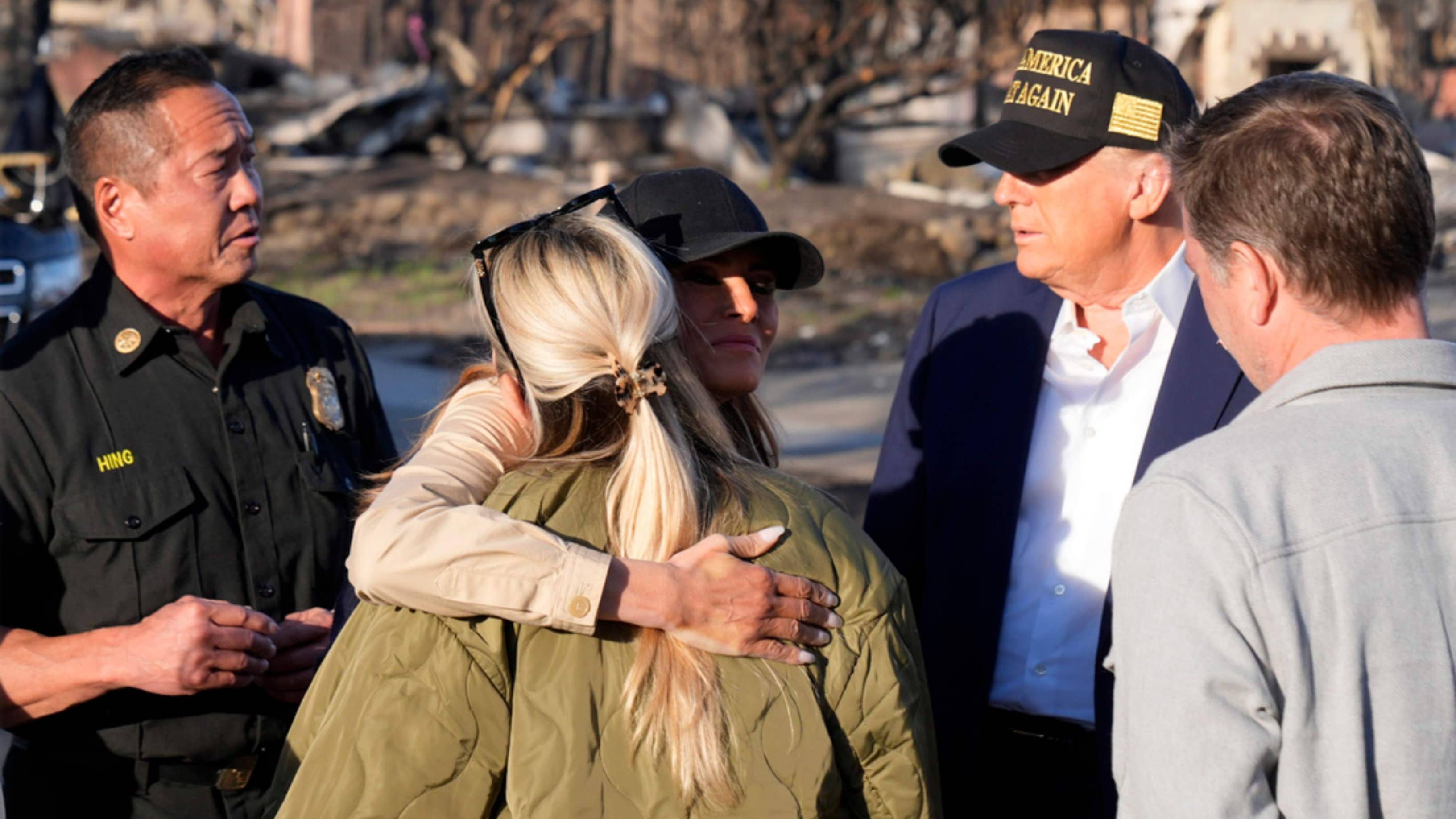 “We're going to need your support. We're going to need your help,” Newsom told Trump. “You were there for us during COVID. I don't forget that, and I have all the expectations we'll be able to work together to get a speedy recovery.” Newsom has praised Trump before when looking for help from the federal government. In the early months of the coronavirus pandemic, he called Trump “thoughtful” and “collaborative.” Trump flew over several devastated neighborhoods in Marine One, the presidential helicopter, before landing in Pacific Palisades, a hard-hit community that's home to some of Southern California's rich and famous. Accompanied by first lady Melania Trump, he walked a street where all the houses have burned, chatting with residents and police officers.