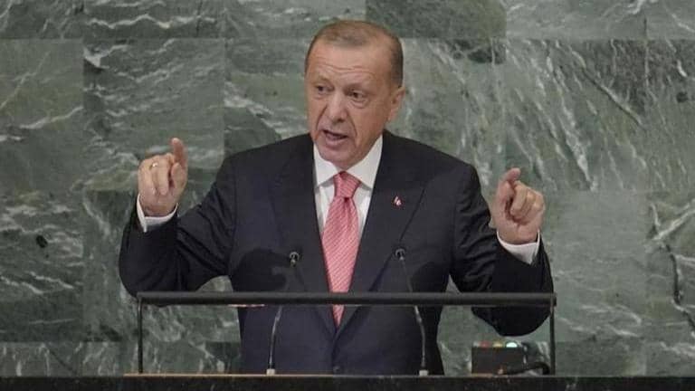 Turkish President Recep Tayyip Erdogan once again raked up the Kashmir issue during his address at the United Nations General Assembly (UNGA) session on Tuesday. Erdogan said India and Pakistan have not been able to establish peace in the region even after 75 years of their independence. Addressing world leaders at the high-level meeting, the Turkish President hoped for "permanent peace" in Kashmir. His assertions for 'peace' come at a time when Turkey's own internal problems have seen its inflation cross 80% and daily threats being made to go to war with its neighbour Greece.