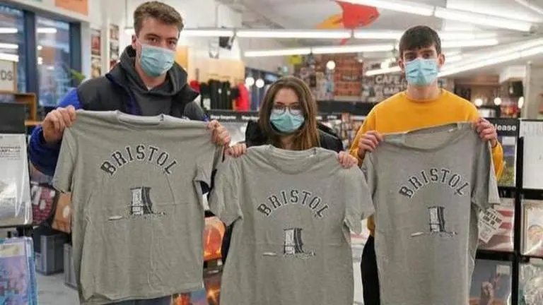 People lined up Saturday in the English city of Bristol to get the latest work by elusive street artist Banksy — a T-shirt created to help four defendants charged over the toppling of a local statue of a slave trader. The gray shirt features the word Bristol above an empty plinth like the one on which the statue of 17th-century slave merchant Edward Colston long stood. Anti-racism demonstrators pulled down the statue and and dumped it in Bristol harbor in June 2020 amid global protests over the police killing of a Black American man, George Floyd.