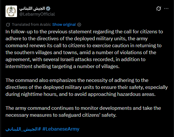 Lebanese Army Says Israeli Attacks Violate Ceasefire, Urges Caution in South