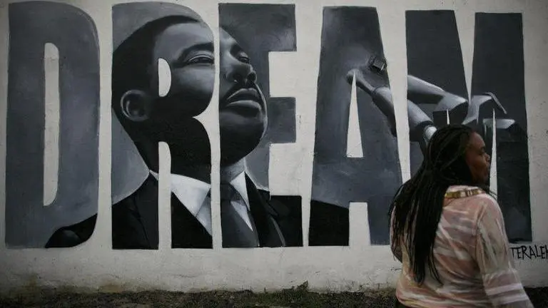 On a small building that backs up to freight train tracks on Compton Avenue, an image of Martin Luther King Jr. is painted on a wall across the word, “DREAM.”