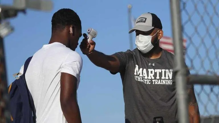 States allowing summer workouts are requiring social distancing measures and health checks. That includes regular sanitizing of equipment, space limits between athletes, and symptom and temperature checks before arrival. Contact drills are restricted and athletes are told to avoid shaking hands and giving high fives. States do not appear to require the testing of high school athletes, citing costs and difficulty with managing such large numbers. A 16-page guidance manual distributed by the national federation did not include recommendations for regular testing of athletes.