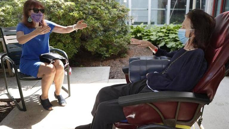Under strict Massachusetts guidelines aimed at avoiding a spike in coronavirus cases, visits must be scheduled and take place in designated outdoor areas, with the exception of end-of-life situations.