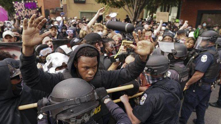 Police say two officers have been shot and wounded amid protests in Louisville, Kentucky, over a lack of charges in the Breonna Taylor case.