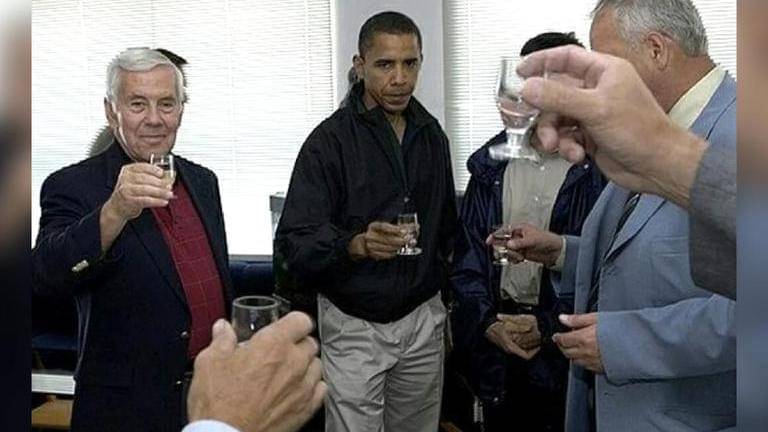 The image in question features Obama and US Senator Richard Lugar in the company of several other men, holding glasses filled with clear liquid, which could possibly be vodka. Since the image went online, it has garnered over 12,000 upvotes along with hundreds of comments. Notably, a New York Times article dating back to 2008 has a mention that in 2005, when Obama went to Russia, he "priggishly requested that his vodka shot glass be filled with water," reported Sputnik.