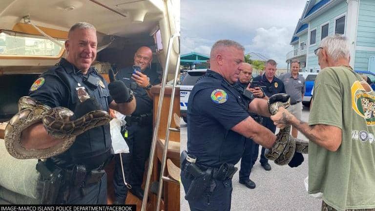 “Officers responded to a call for a snake on a boat at Rose Marina today, Officer Prigge was able to capture the python and release it to local wildlife handler Bobby Monroe,” the Marco island police department wrote in a Facebook post.
