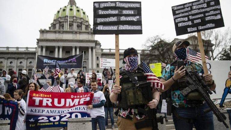 In Pennsylvania, Republican state Rep. Russ Diamond, blasted Gov. Tom Wolf’s “lockdown,” while GOP state Sen. Doug Mastriano urged protesters to “rise up” and “say ‘no’ to tyranny.”