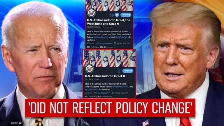 In what comes as the first controversy of Joe Biden's presidency, the US Embassy in Israel changed its Twitter account name and included West Bank and Gaza on January 20 around 1:05 AM. After reflecting the same for around two hours, the name was changed back to 'U.S Ambassador to Israel'. The changed name showed as 'U.S Ambassador to Israel, West Bank and Gaza.' The changed sparked an immediate row on social media and policy observers wondered if it hints at a change in a foreign policy under President Joe Biden. However, issuing a clarification, spokesman for the embassy gave a statement to The Times of Israel, and said that changes "did not reflect a policy change or indication of future policy change" and that "it was an inadvertent edit."