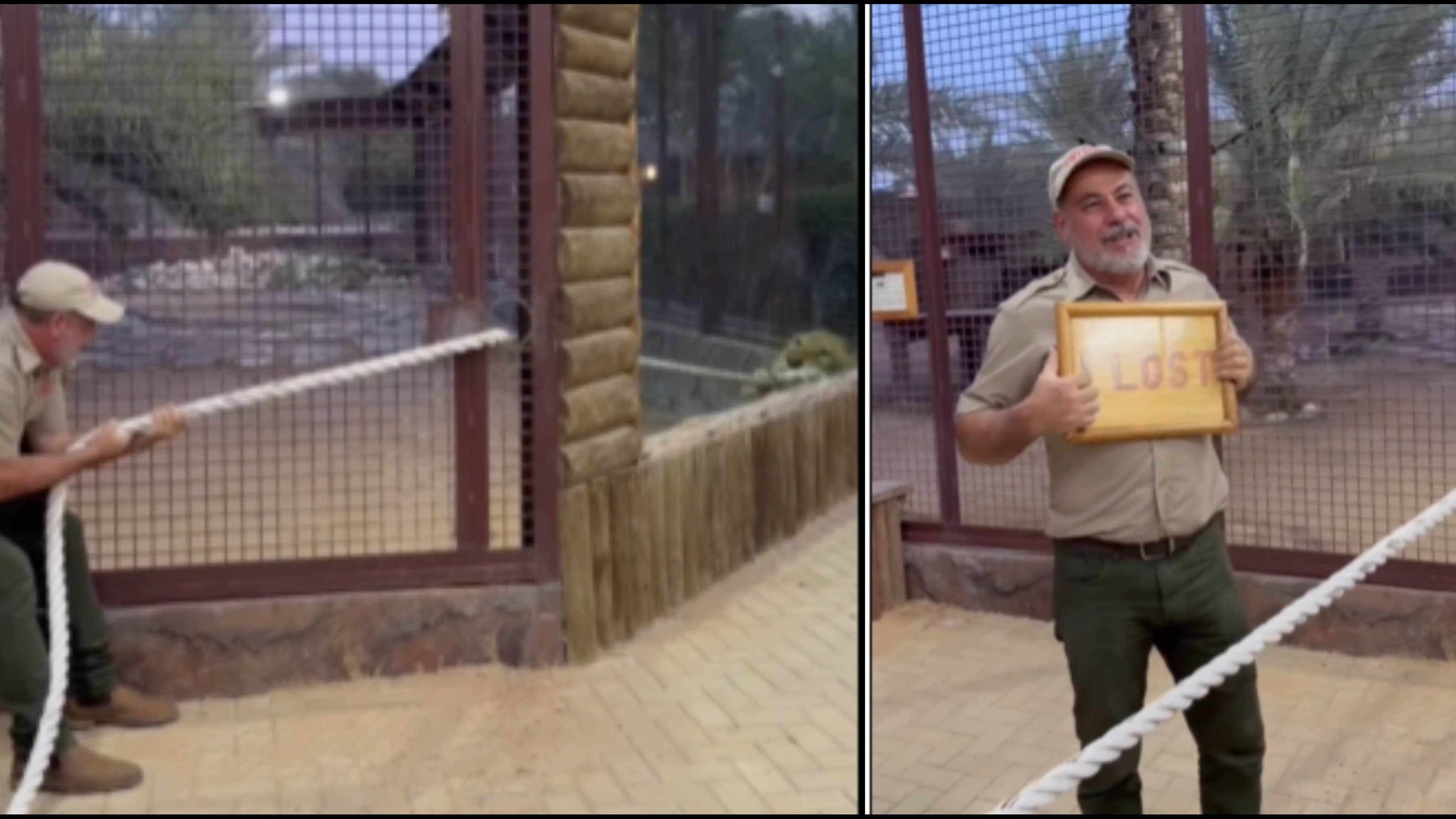 Zookeeper's brave tug of war with lion goes viral; humility and humor win hearts online in spirited showdown.