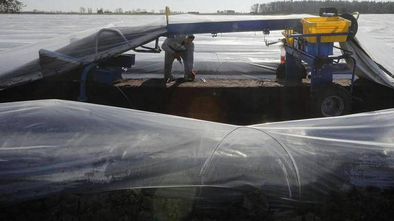 “As things stand, it is not possible to bring harvesters to Germany, which is a disaster,” says Hoffheinz in a field full of asparagus covered with plastic sheeting at Genthin, west of Berlin.
