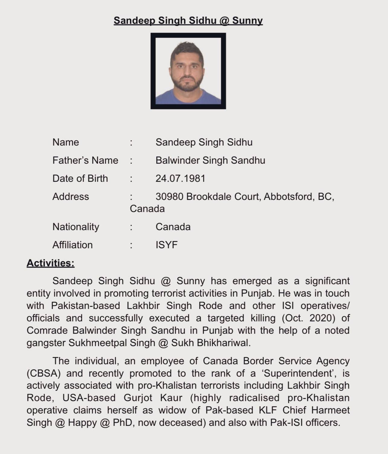 Sandeep Singh Sidhu, also known as Sunny, is an employee of the CBSA and is reportedly affiliated with the banned International Sikh Youth Federation (ISYF), a group with ties to Khalistani extremism. Sidhu’s name was added to India's list of wanted fugitives based on his alleged role in the assassination of Comrade Balwinder Singh Sandhu, a prominent figure in Punjab 's resistance against Khalistani militants.